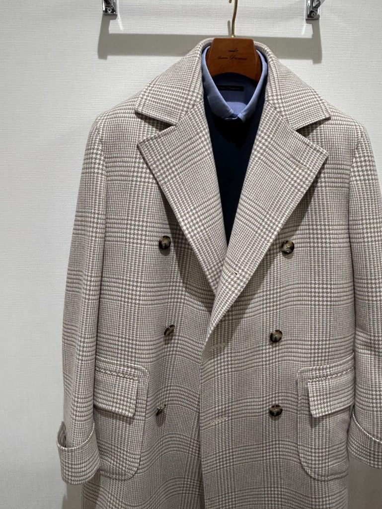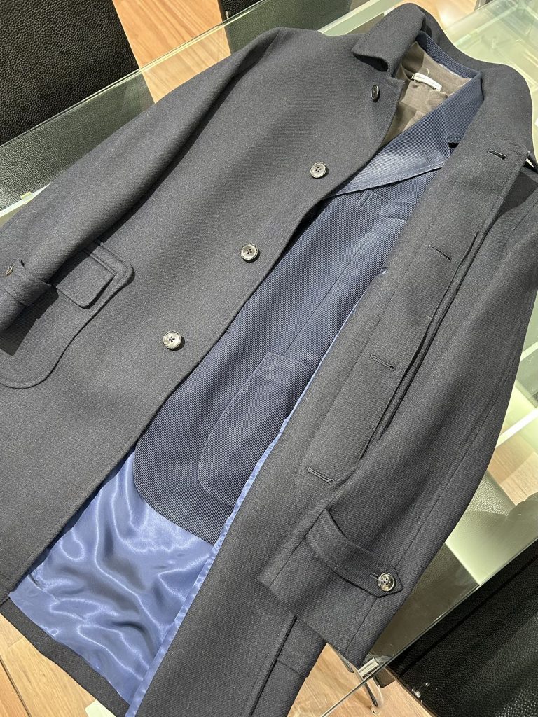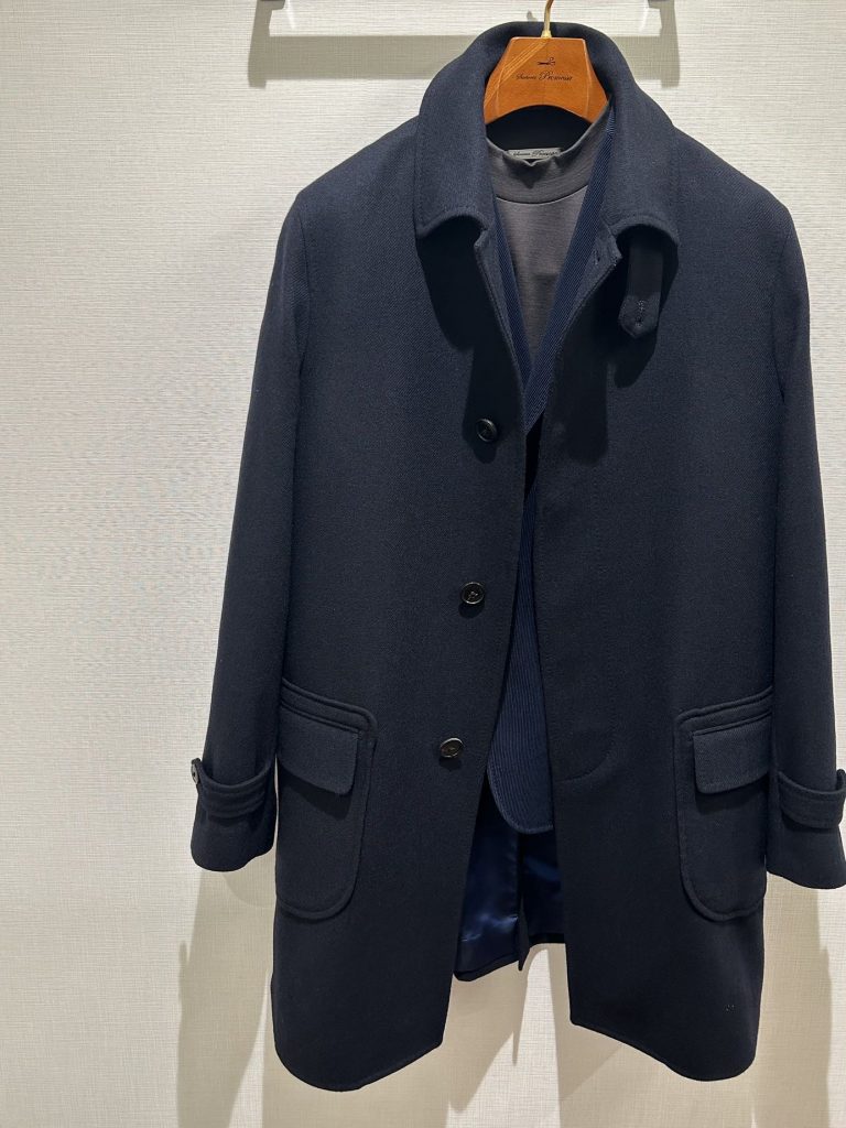 サルトリアプロメッサでは、バルカラーコートのディテールと丈感をアレンジしたミドルレングスコートを提案しています。