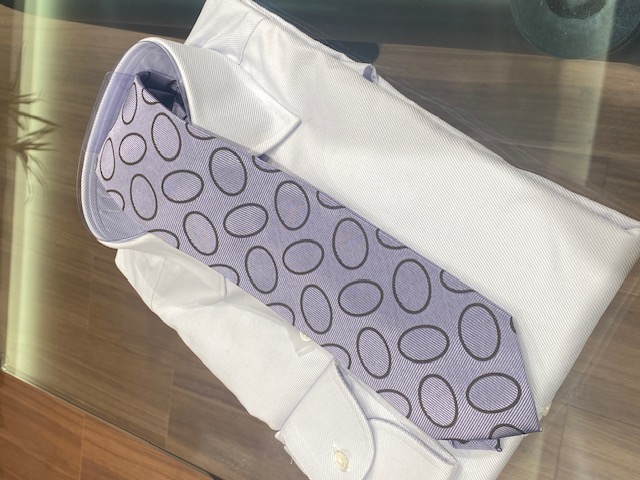 そこにラベンダーベースのサークルモチーフのタイを合わせることで、