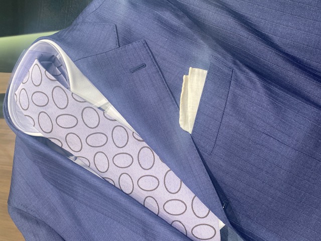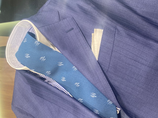 今回の組み合わせでは、スーツの方がやや幅広のストライプなので、