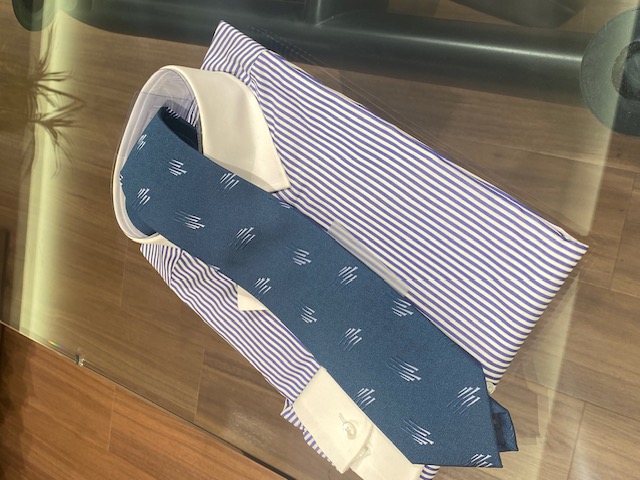 シャツのストライプは幅の狭いものをチョイスしています!