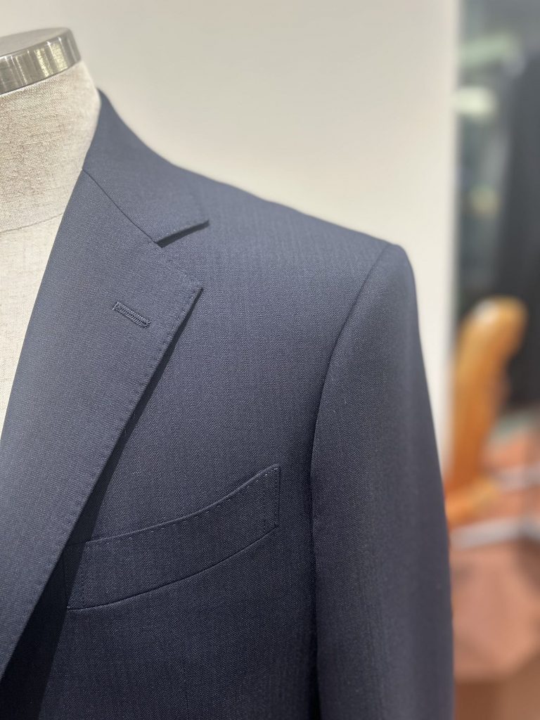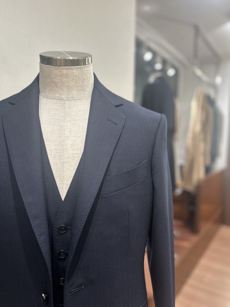 今回は、30・40代 ビジネスマンの方におすすめ。 “ 信頼感 ” を得やすい 【 ネイビー シャドーストライプ × モダンミラノモデル 】のオーダーサンプルの紹介です。