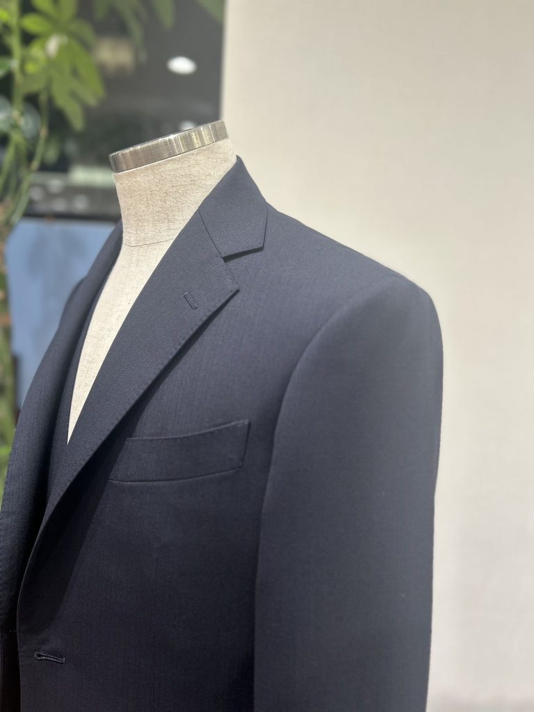 スーツらしいキチンと感を演出する直線的なショルダーライン、肩パットは非常に薄く野暮ったさは皆無です