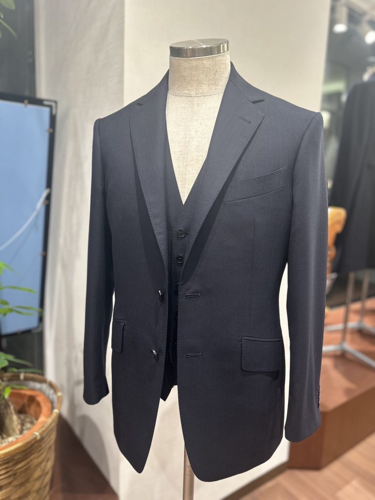 誠実さと清潔感を感じる程よい艶感のダークネイビーシャドーストライプはどんな場面でも悪い印象を持たれることはありません。