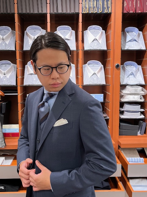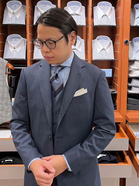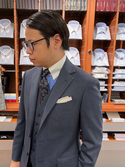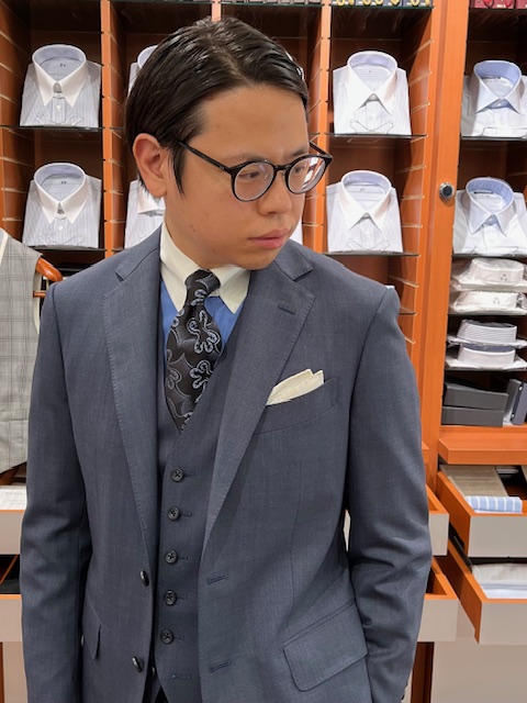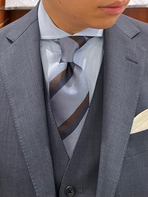 今回は、前回ご紹介のシャークスキンブルーグレースーツのコーディネートを提案させていただきます。