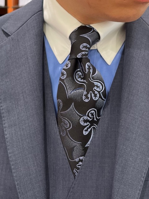 こちらは、ブルーのクレリックのタブカラーシャツにジャガードのネクタイになります。