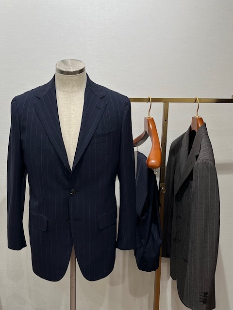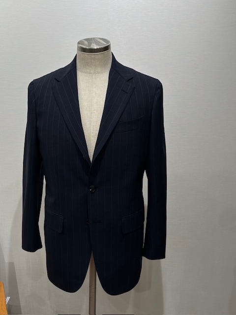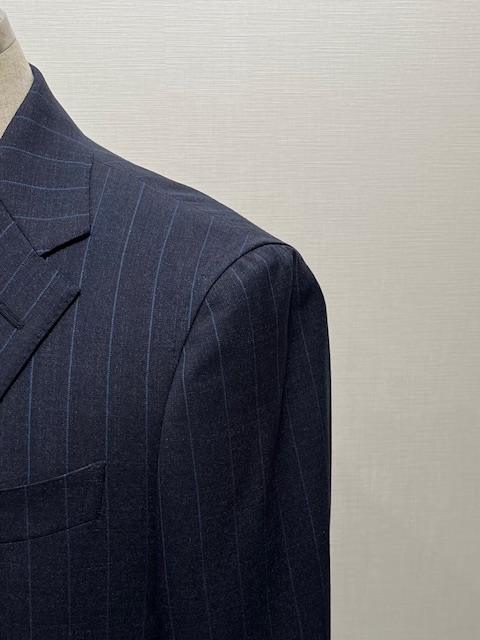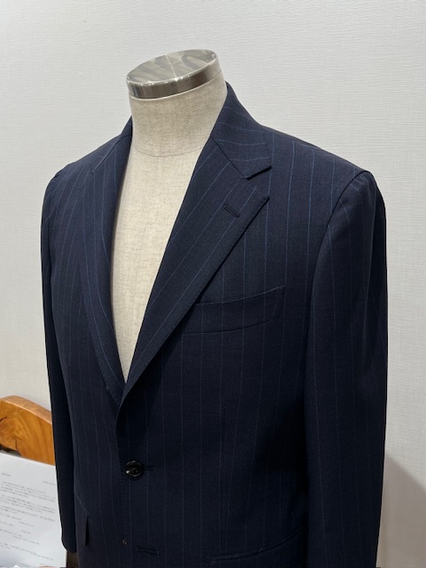 カノニコ ラスティック トロピカルの生地で作成したネイビーにブルーのチョークストライプ柄を、サルトリア プロメッサオリジナルモデ【ROMAN LOOK RELAX】ローマン ルック リラックスのサンプルになります。